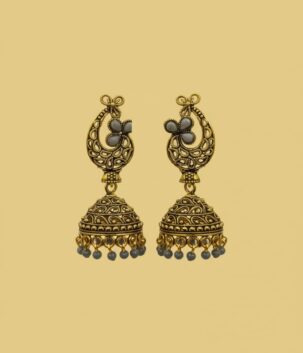 Antique Gold Jhumka Earrings with Grey Stone & Bead Drops