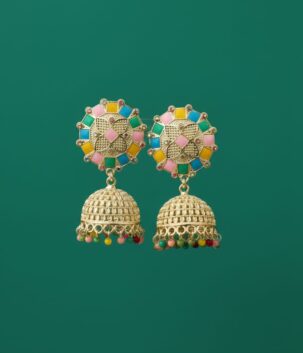 Antique Gold Multicolor Enamel Jhumka Earrings with Bead Drops