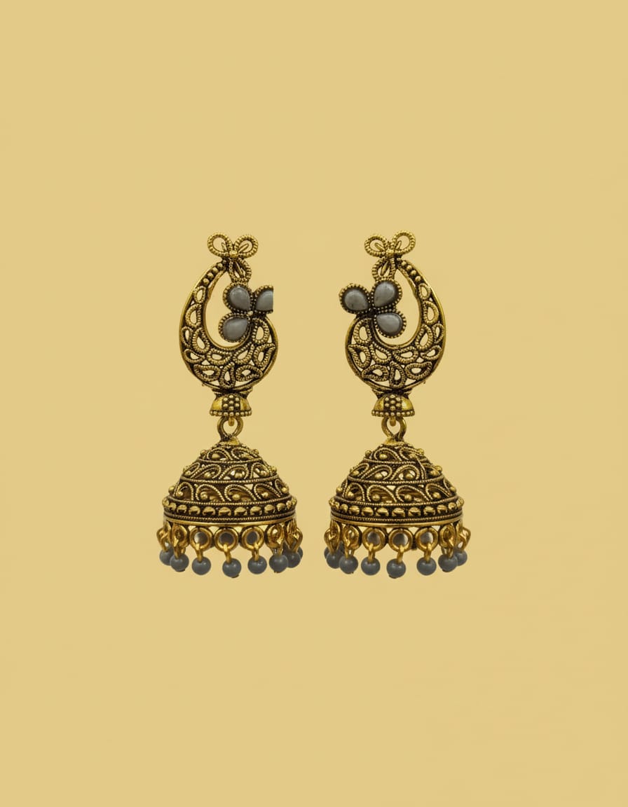 Antique gold jhumka earrings with grey stone accents and matching bead drops—perfect for festive and ethnic wear.