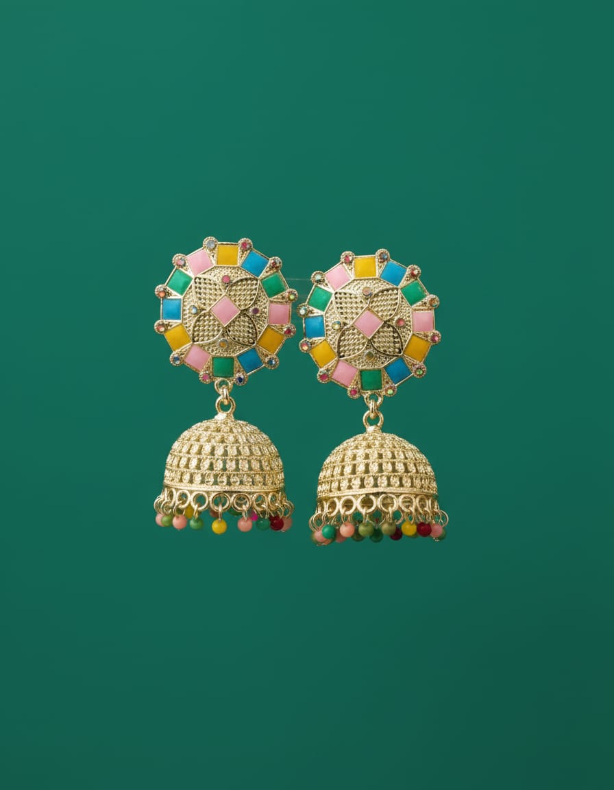 These vibrant antique gold jhumka earrings are beautifully crafted with a circular stud top adorned in rich multicolor enamel work, giving them a festive and contemporary ethnic appeal. The intricately designed dome-shaped jhumkas are finished with colorful bead drops that add playful movement and charm. Lightweight yet eye-catching, these earrings are perfect for festivals, weddings, cultural events, and celebrations. They pair effortlessly with sarees, lehengas, kurtis, and Indo-western outfits, making them a versatile addition to your jewellery collection.
