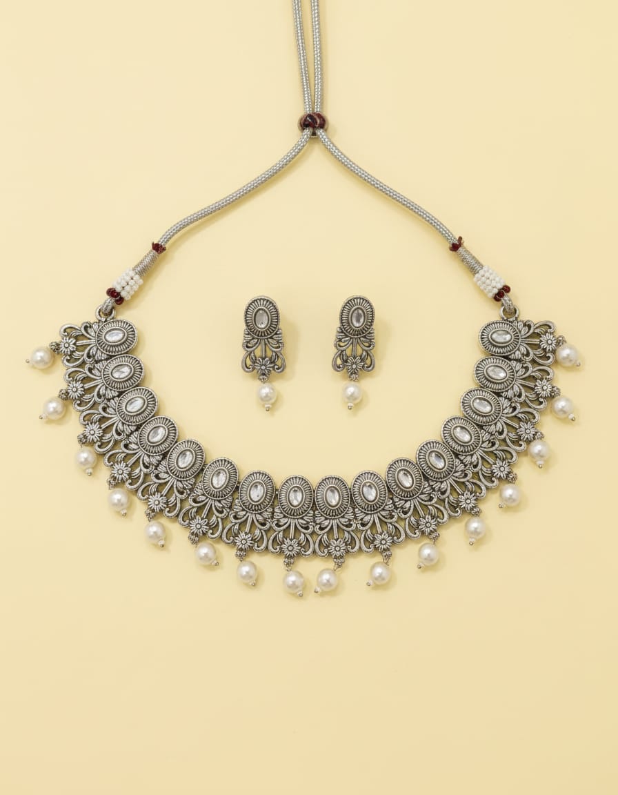 This elegant oxidised silver choker necklace set showcases intricate floral and oval motif detailing inspired by traditional Indian craftsmanship. The beautifully layered design is enhanced with delicate pearl drop accents that add graceful movement and a refined ethnic charm. Paired with matching stud earrings featuring pearl drops, this set is perfect for weddings, festive occasions, and traditional celebrations. Lightweight yet statement-worthy, it sits comfortably around the neck and complements sarees, lehengas, and ethnic outfits effortlessly.