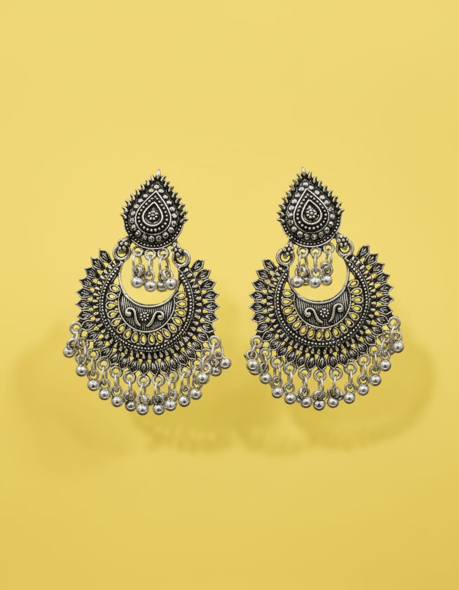 These stunning oxidised silver layered chandbali earrings are a perfect blend of traditional elegance and intricate craftsmanship. Designed with detailed engravings, leaf-inspired patterns, and a beautifully layered crescent structure, these earrings make a bold ethnic statement. The delicate dangling silver beads at the bottom add graceful movement and enhance their classic appeal. Lightweight yet eye-catching, these earrings are ideal for weddings, festive occasions, cultural events, and traditional celebrations. They pair effortlessly with sarees, lehengas, anarkalis, and ethnic kurtas.