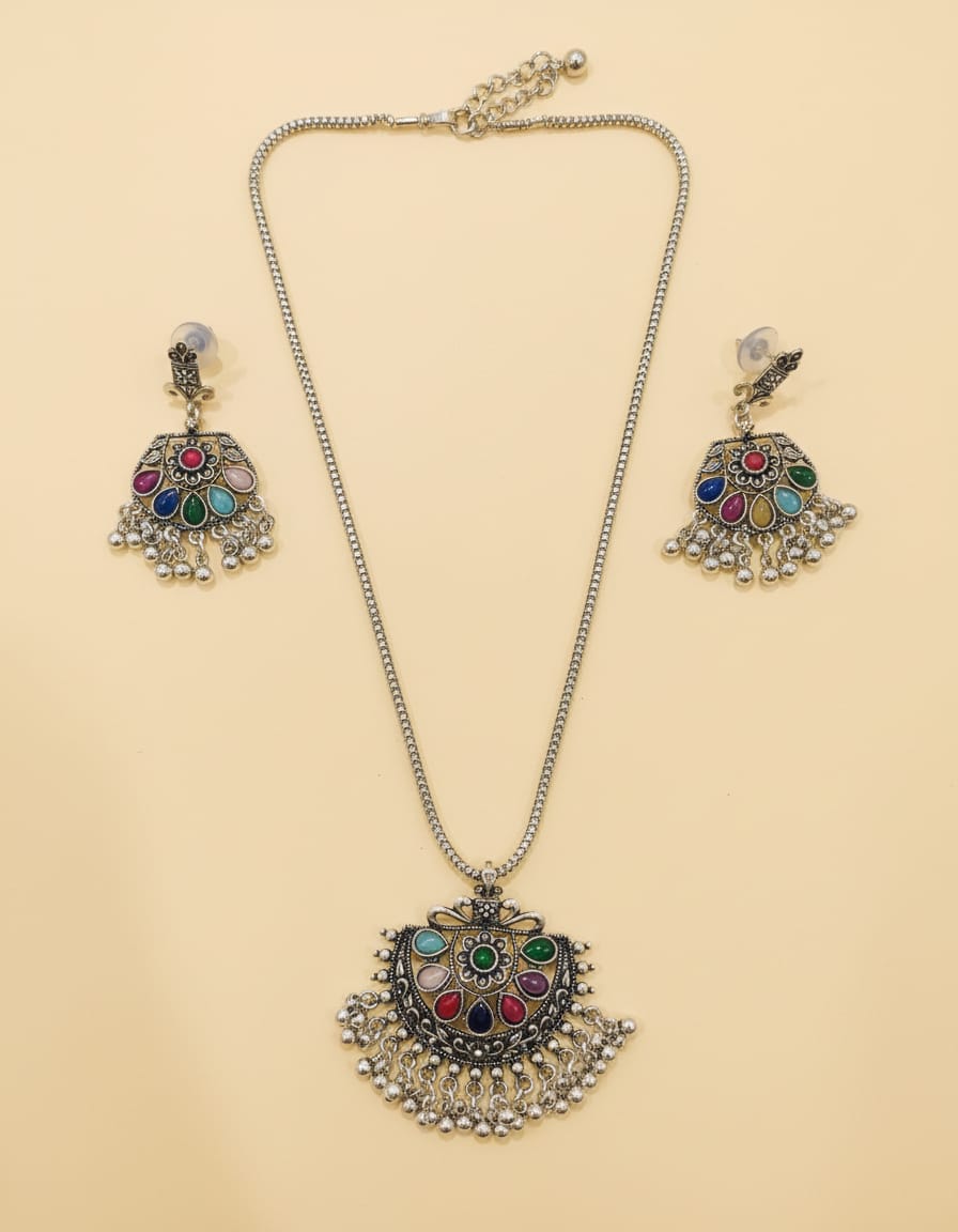 This elegant oxidised silver necklace set features a beautifully handcrafted traditional pendant adorned with vibrant multicolour stones that add a rich ethnic charm. The pendant is finished with delicate dangling silver bead detailing, creating graceful movement and a statement look. Paired with a sleek oxidised silver chain and matching jhumka-style earrings, this set is perfect for elevating your ethnic and fusion outfits. Lightweight yet eye-catching, it is ideal for festive occasions, cultural events, and celebrations.