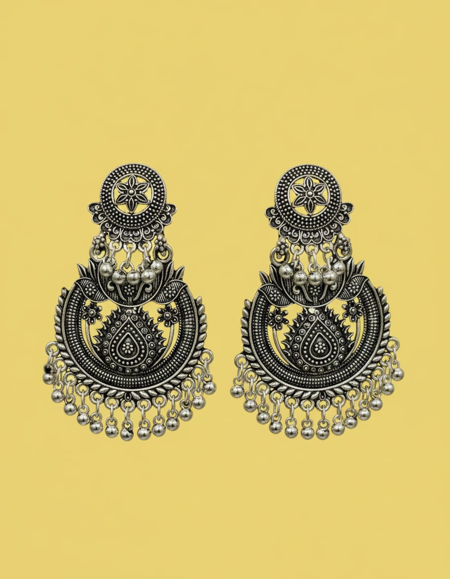 These elegant oxidised silver chandbali earrings showcase timeless Indian craftsmanship with intricate floral detailing and fine engraved patterns. The dangling ghungroo-style beads add graceful movement, making them a perfect statement accessory. Lightweight and comfortable, these earrings are ideal for long wear and effortlessly enhance your ethnic look. Perfect for weddings, festivals, parties, or everyday ethnic styling.