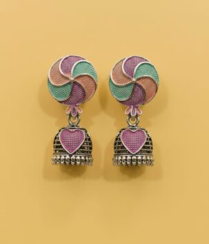 Oxidised Silver Multicolor Enamel Jhumka Earrings with Heart Detail