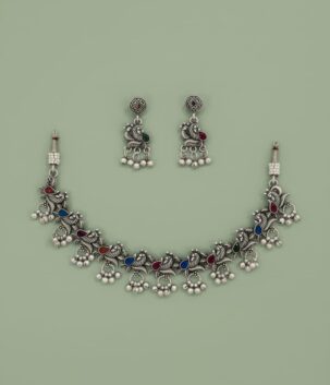 Oxidised Silver Peacock Motif Necklace Set with Pearl Drops