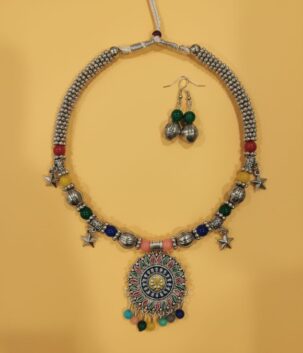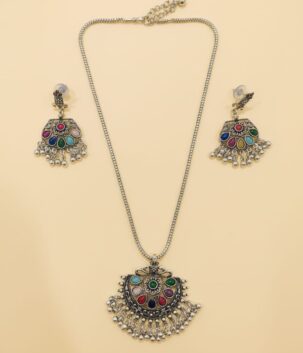 Oxidised Silver Multicolour Stone Pendant Necklace Set