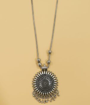 Oxidised Silver Sunburst Pendant Long Necklace