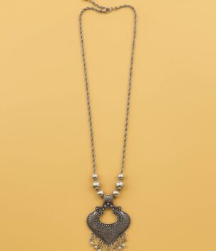 Oxidised Silver Tribal Crescent Pendant Long Necklace